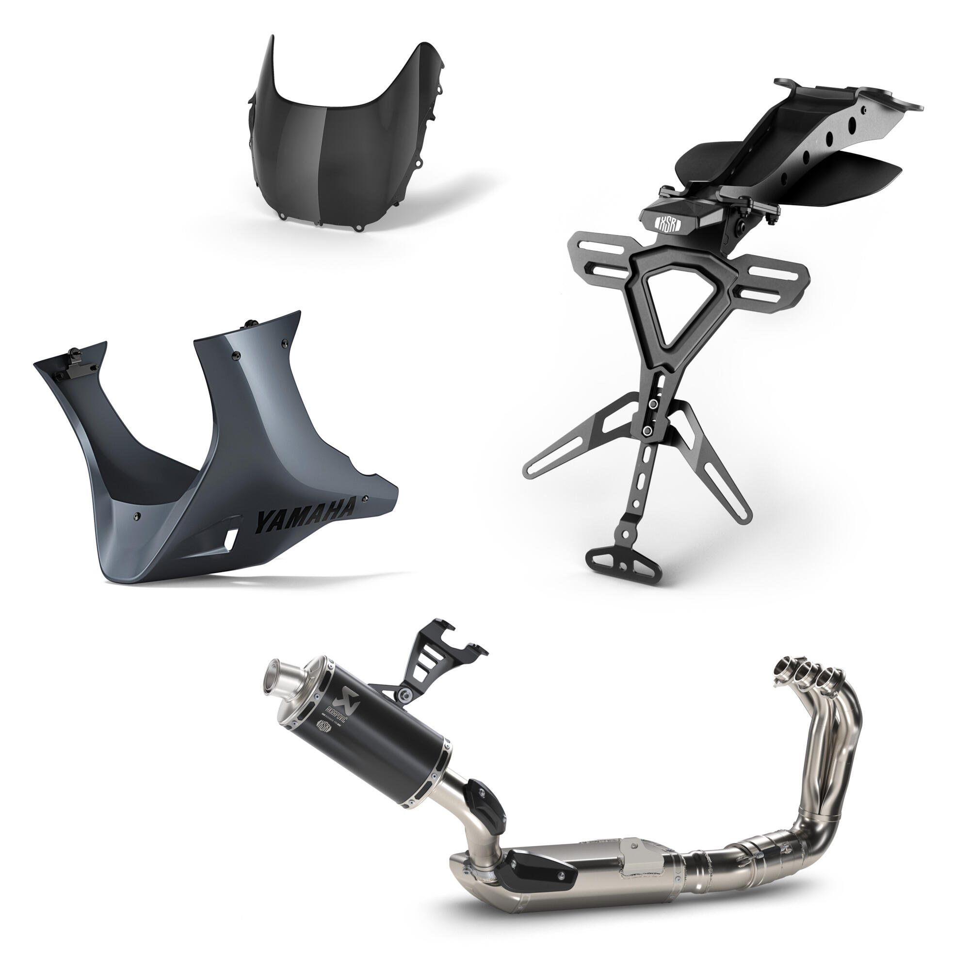 Im Lieferumfang ist außerdem eine sportliche Kennzeichenhalterung enthalten, die die aggressive Silhouette des Heckbereichs betont und gleichzeitig die Aerodynamik des Fahrzeugs verbessert. Das Highlight des Pakets ist der Akrapovič-Auspuff, der für seine hochwertige Verarbeitung und klangliche Optimierung bekannt ist. Dieser sorgt für eine spürbare Leistungssteigerung und einen charakteristisch tiefen Motorsound, der jede Fahrt zu einem besonderen Erlebnis macht.