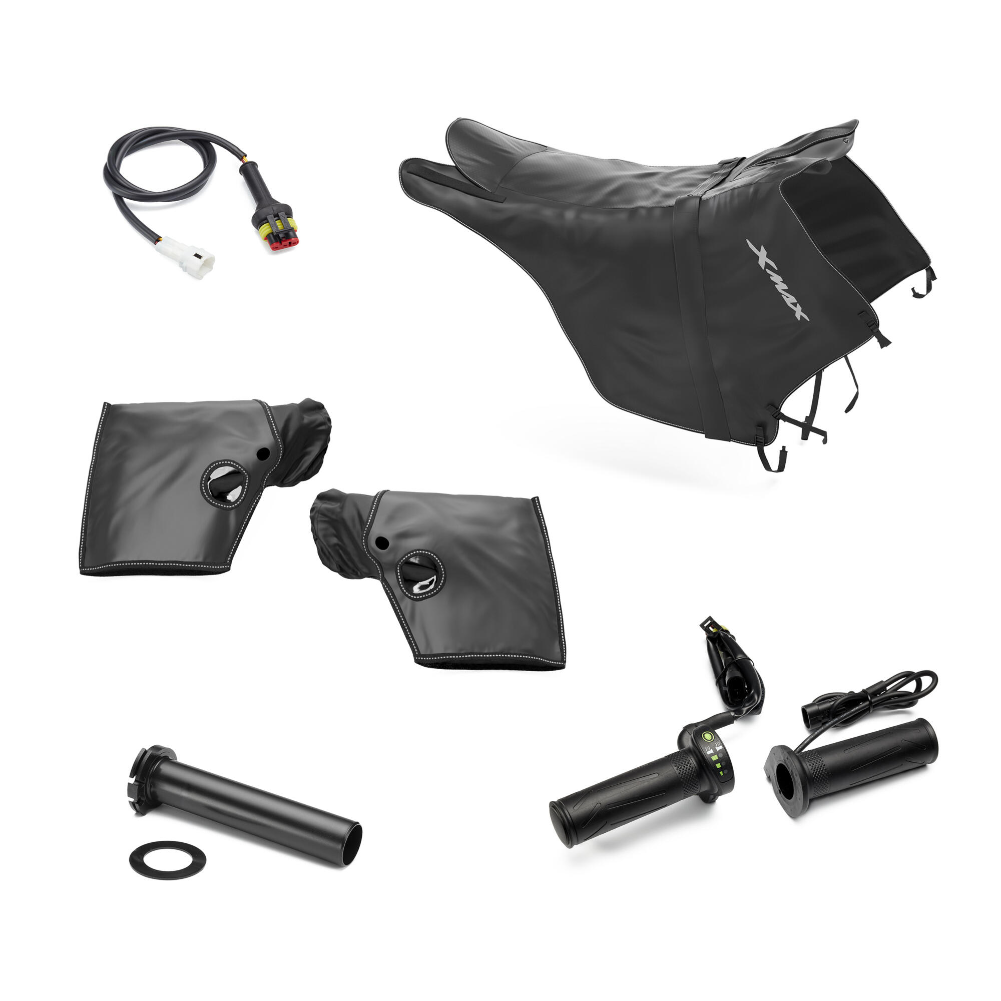 Ein wesentlicher Bestandteil des Sets sind die Lenker-Muffs, die als spezielle Handabdeckungen am Lenker montiert werden. Sie blockieren effektiv kalten Wind und halten die von den beheizbaren Griffen erzeugte Wärme zurück. So bleiben Ihre Hände trocken und geschützt, was die Kontrolle über das Fahrzeug verbessert und die Sicherheit bei widrigen Wetterbedingungen erhöht. Das schwarze Design der Zubehörteile fügt sich harmonisch in das Erscheinungsbild des XMAX ein und bewahrt dessen stilvolle Optik.