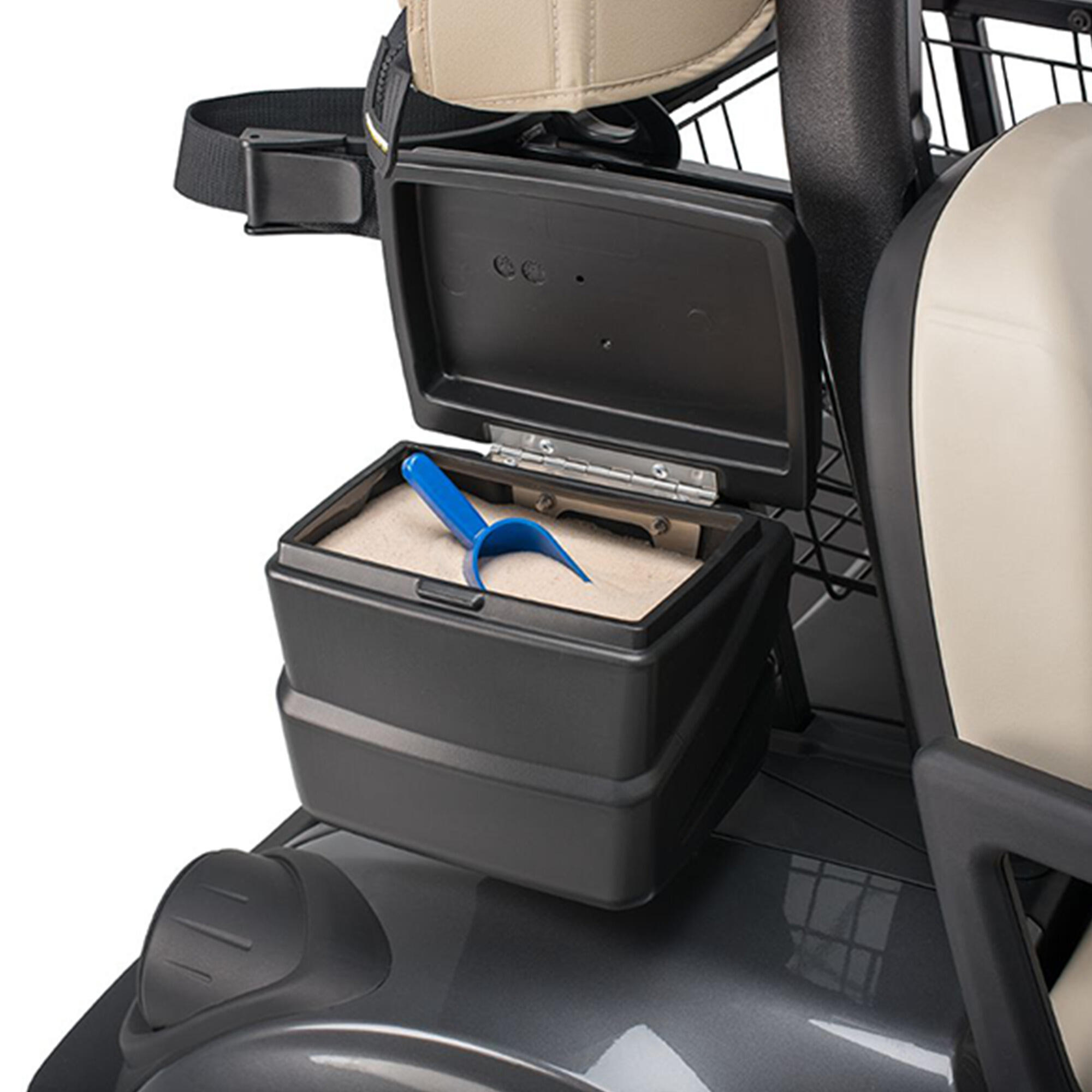 Die regendichte Abdeckung schützt den Inhalt zuverlässig vor Feuchtigkeit und verhindert störendes Klappern, sodass Sie sich ganz auf Ihr Spiel konzentrieren können. Das durchdachte Montagesystem ermöglicht die Befestigung sowohl auf der linken als auch auf der rechten Seite des Wagens und enthält alle notwendigen Komponenten für eine einfache Installation. Der zweiteilige Halter mit formgepresstem Griff trägt bis zu 12,72 kg Sand und sorgt für eine stabile und sichere Befestigung während des Transports.