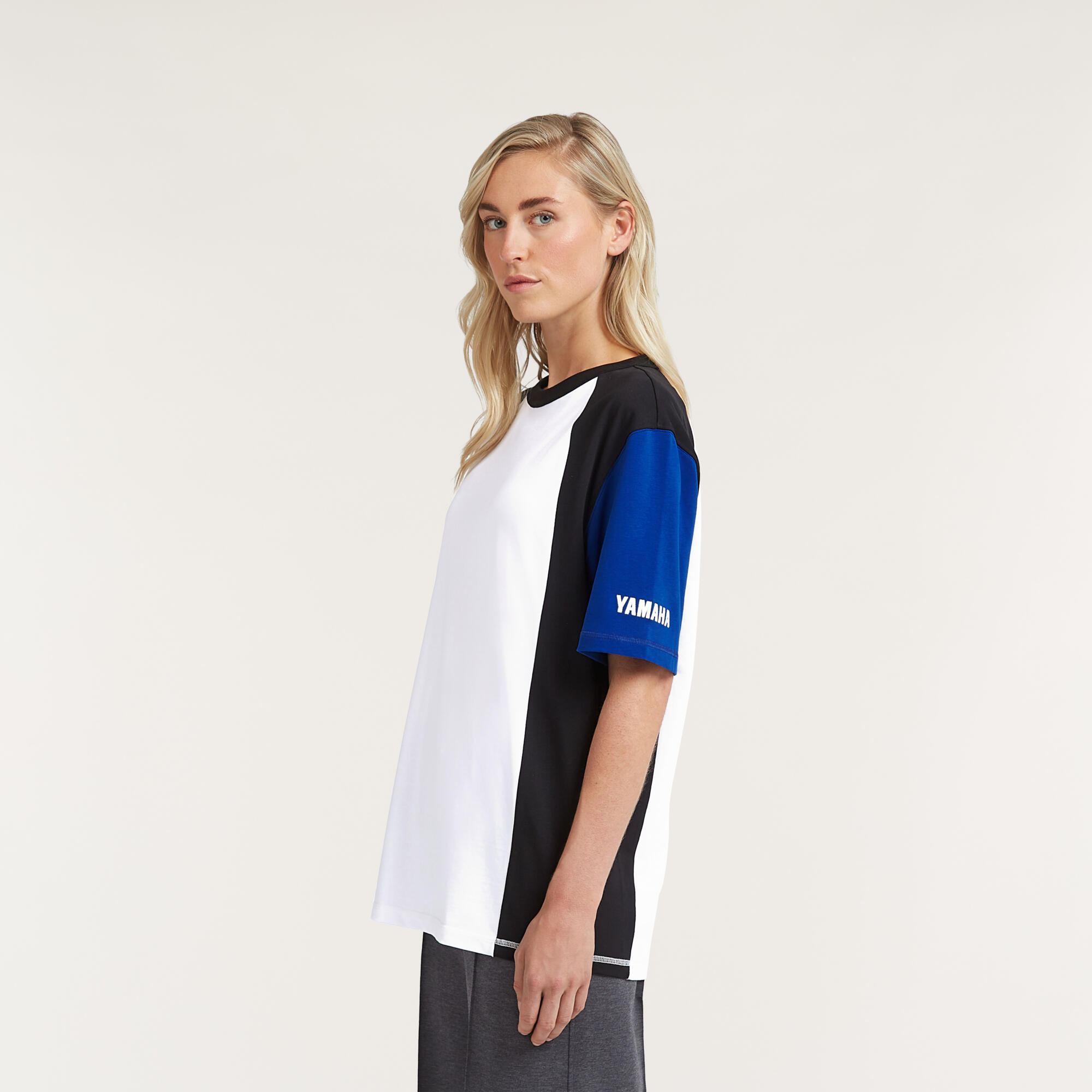 Das moderne Design besticht durch ein dreifarbiges Muster in Blau, Schwarz und Weiß, das dem Shirt eine dynamische Ausstrahlung verleiht. Der lockere, kastige Schnitt mit breiten Ärmeln ermöglicht uneingeschränkte Bewegungsfreiheit, was besonders bei Outdoor-Aktivitäten von Vorteil ist. Kontrastierende Einsätze setzen nicht nur modische Akzente, sondern erhöhen auch die Sichtbarkeit und den individuellen Stil, sodass Sie garantiert auffallen.